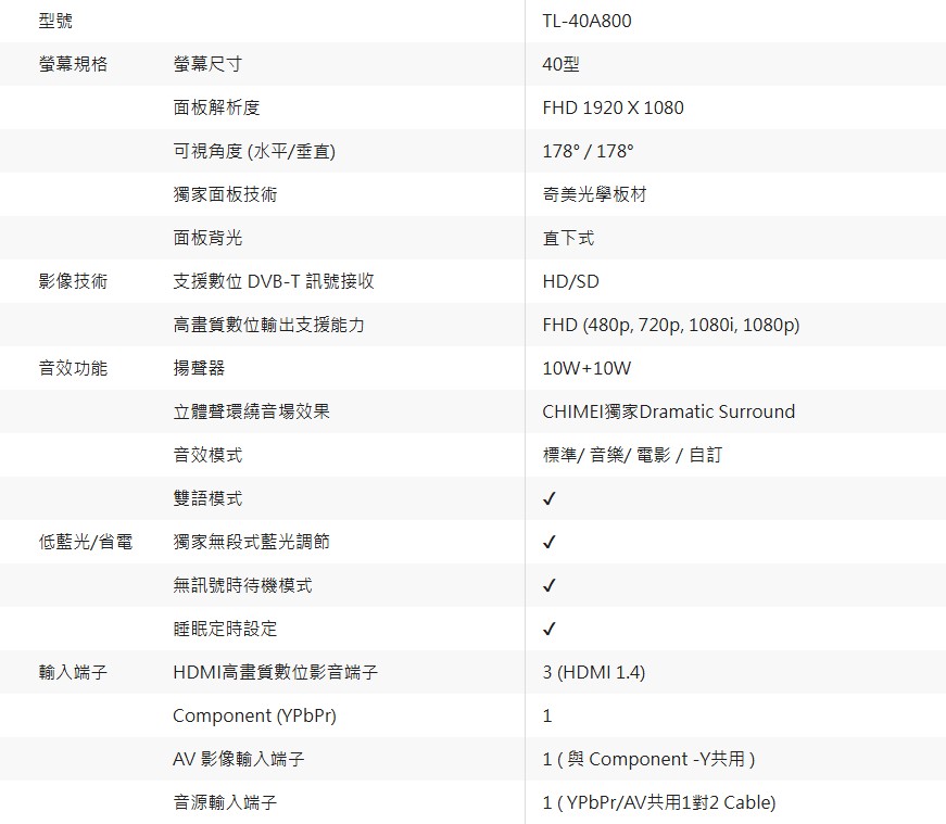 上揚家電-奇美40型Full HD液晶顯示器(TL-40A800)