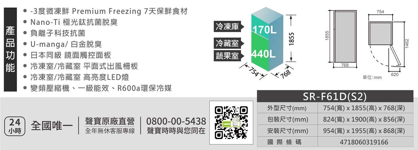 上揚家電-聲寶變頻兩門冰箱610公升(SR-F61D(S2))
