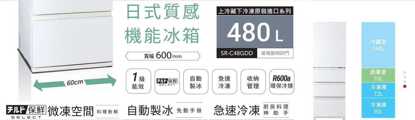 上揚家電-聲寶上冷藏下冷凍玻璃變頻四門冰箱480公升(SR-C48GDD)