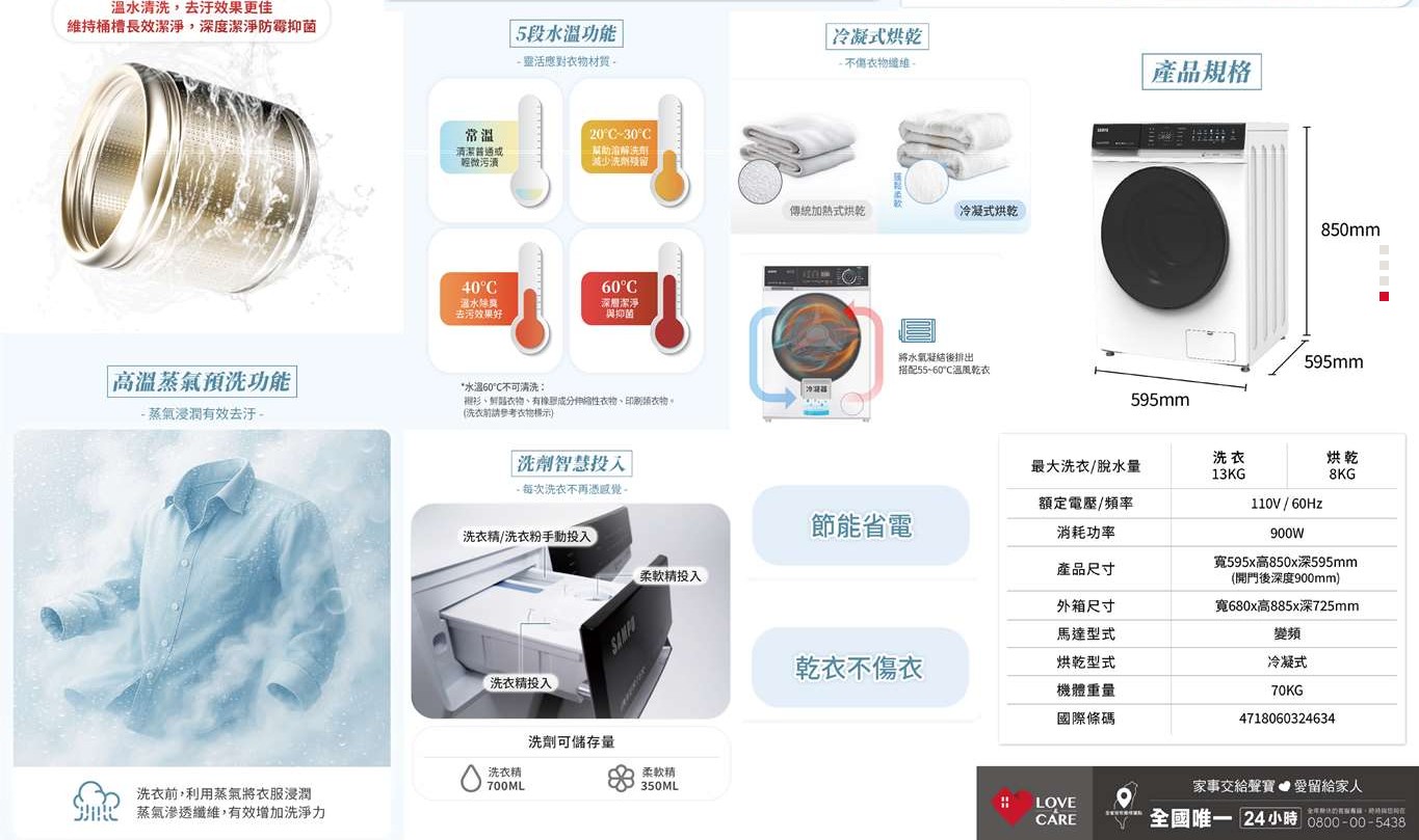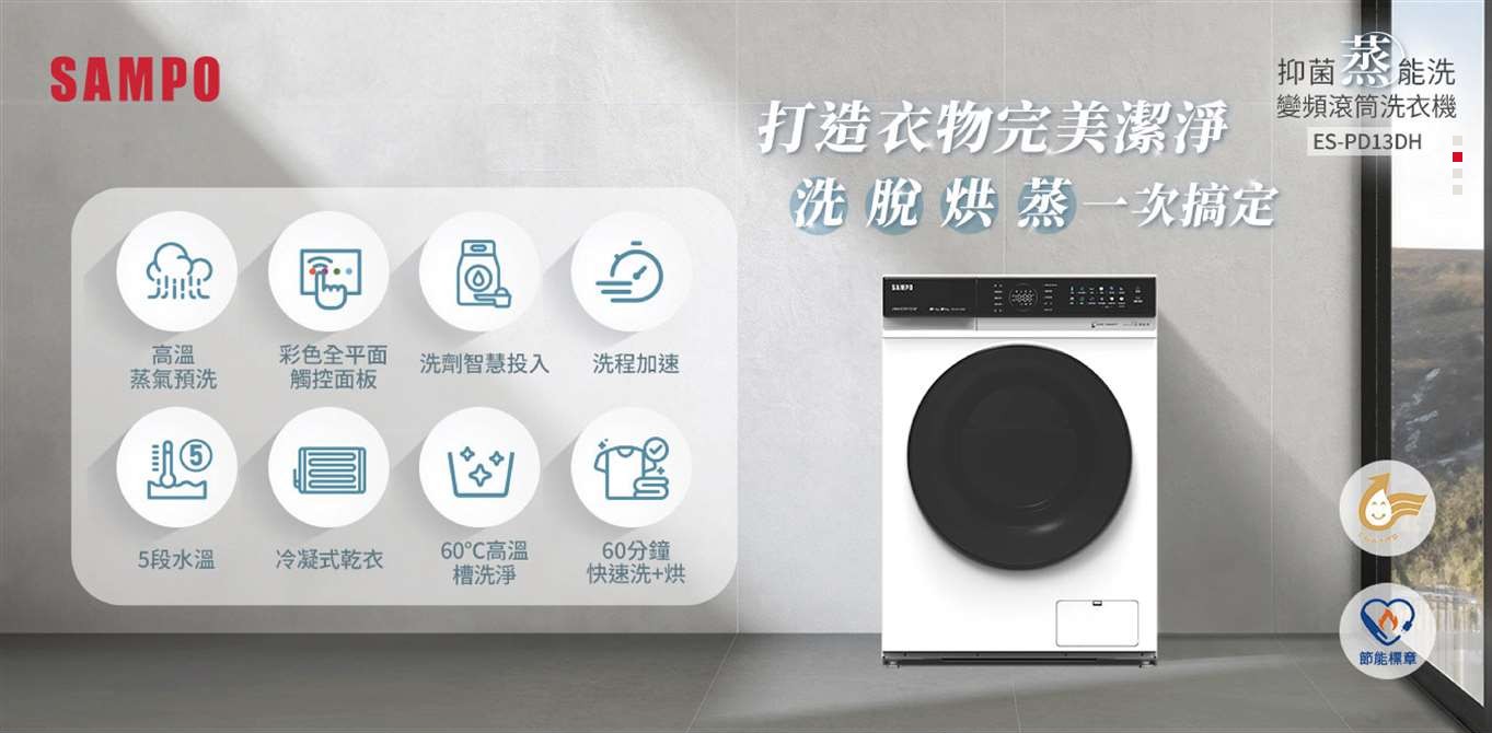 上揚家電-聲寶變頻滾筒洗脫烘13公斤/洗劑智慧投入(ES-PD13DH)